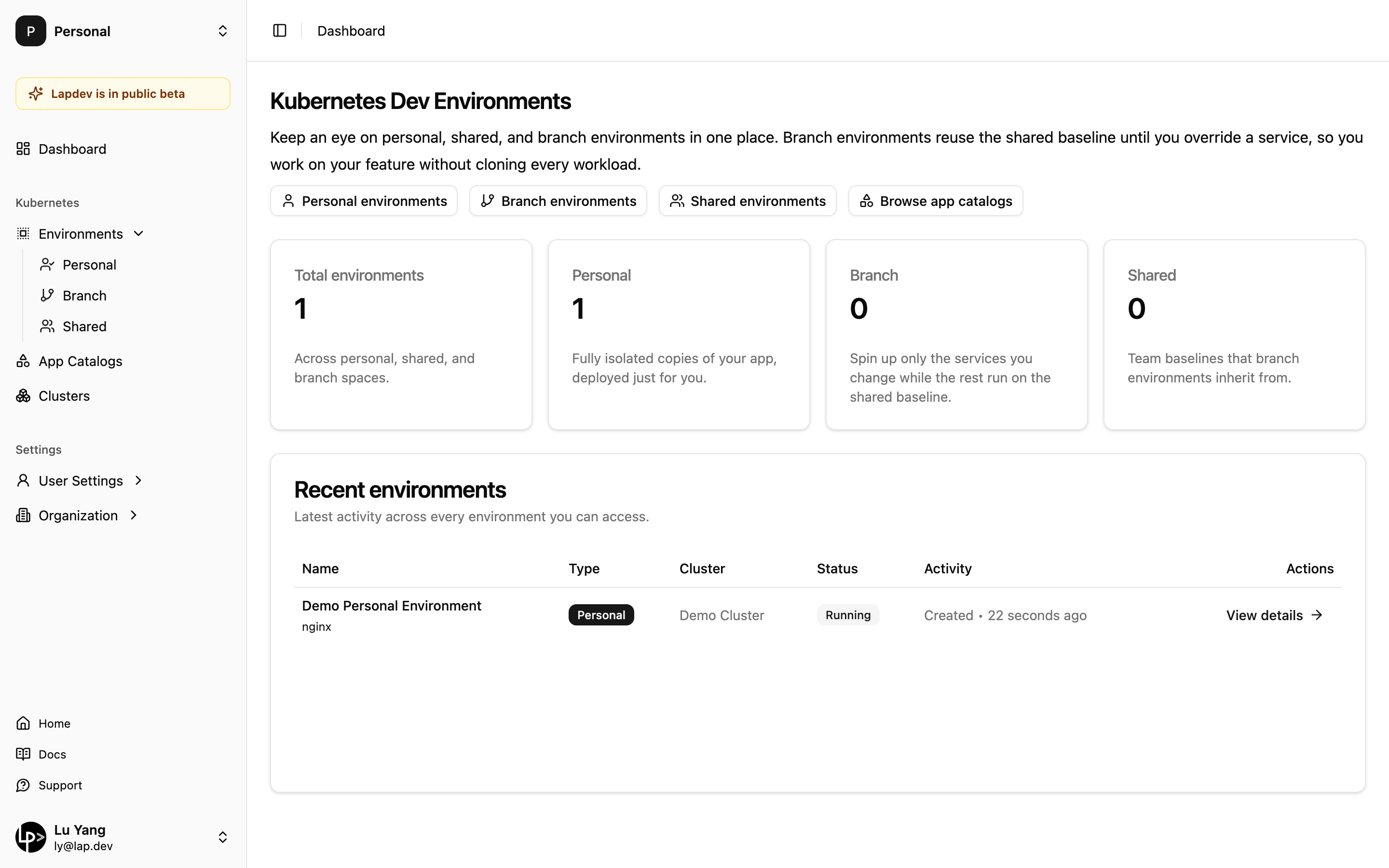 Lapdev gives your team production-accurate development environments that run directly in your Kubernetes cluster. Install the lightweight lapdev-kube-manager, choose the workloads you care about, and Lapdev keeps isolated or shared environments in sync with your production manifests. Developers iterate quickly using the Devbox CLI for local debugging while staying connected to real cluster resources.