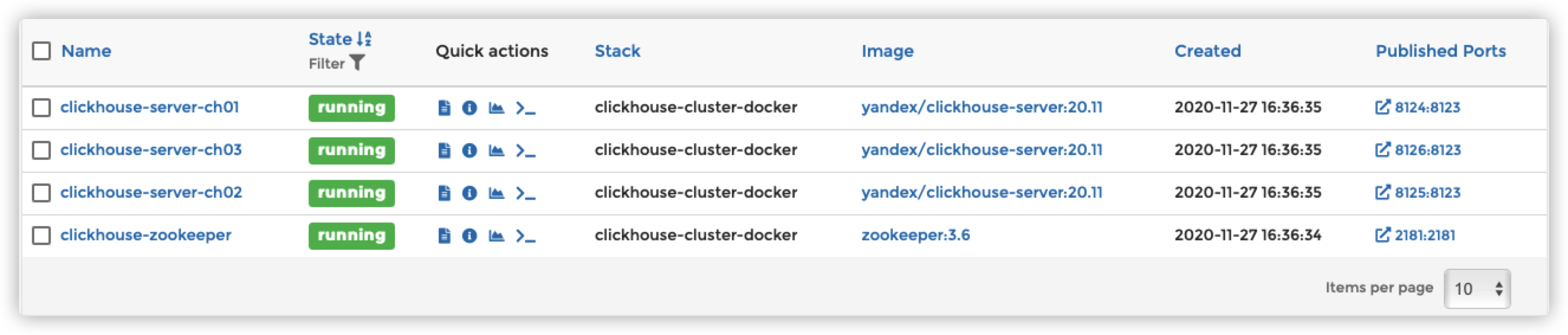 docker-compose upThe default created cluster nodes includes 1 zookeeper node, 3 clickhosue-server nodes (3 shards, 1 replica each node).