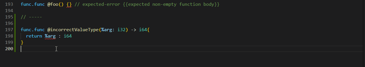 MLIR provides infrastructure for checking expected diagnostics, which is heavily utilized when defining IR parsing and verification. The language server provides code actions for automatically inserting the checks for diagnostics it knows about.