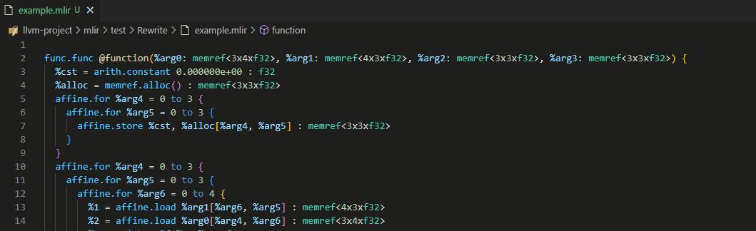 The MLIR extension adds language support for the MLIR textual assembly format: