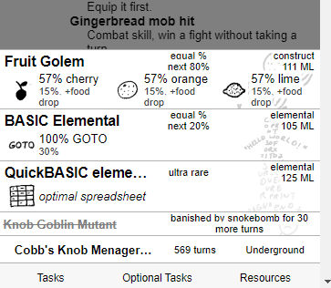 When you aren't hovering over the summary, it will show you the bottom part of that screenshot: the name of the zone, the environment of the zone (Underground, Indoors, Outdoors, etc) and the number of turns you've spent in the zone (including freeruns and delay you've burned there). This is useful for delay burn tracking and complaining about how long a task is taking during your ascension, one of the most important parts of KOL. When you hover over the summary, it will show you the monsters within the zone, the phylum of the given monsters, their respective item drop tables, and the projected probability that you will encounter any given monster in the zone on your incoming turn, based on KoLMafia's calculation of rejection probability and the current banishes. It will also show you which monsters in the zone are banished, ultra rares that exist within the zone, and the drop rate of items on monsters in the zone in their drop tables. Here, when it says "100%" for the GOTO item, that means that my item drop % is high enough that I can cap a 30% drop; I will get it every time I fight a BASIC Elemental.