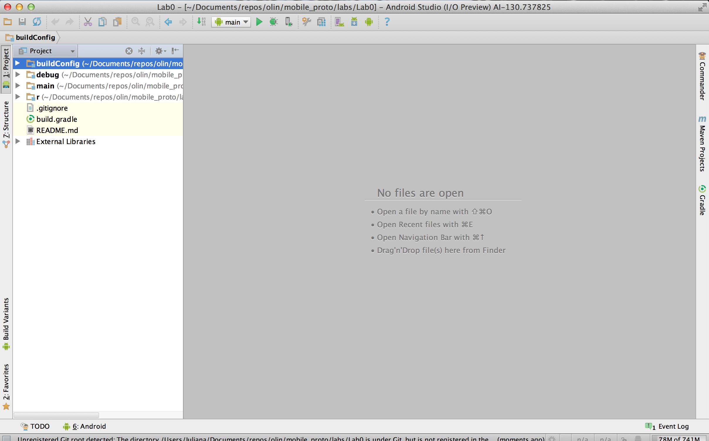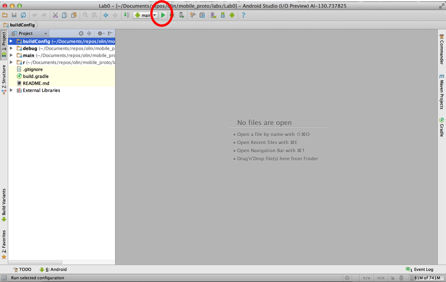 - One the app opens, it will look like this. Notice the Lab0 header on the top of Android Studio.