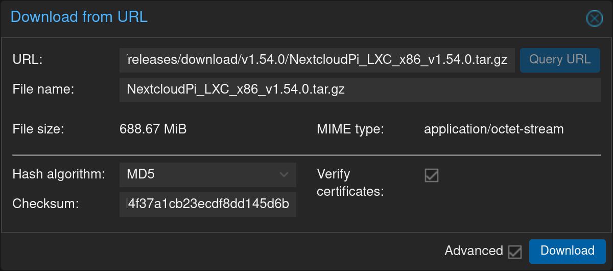 Optionally, you can copy the corresponding md5 sum from the releases page and paste it in the "Checksum" field to have Proxmox check that the downloaded image was not corrupted