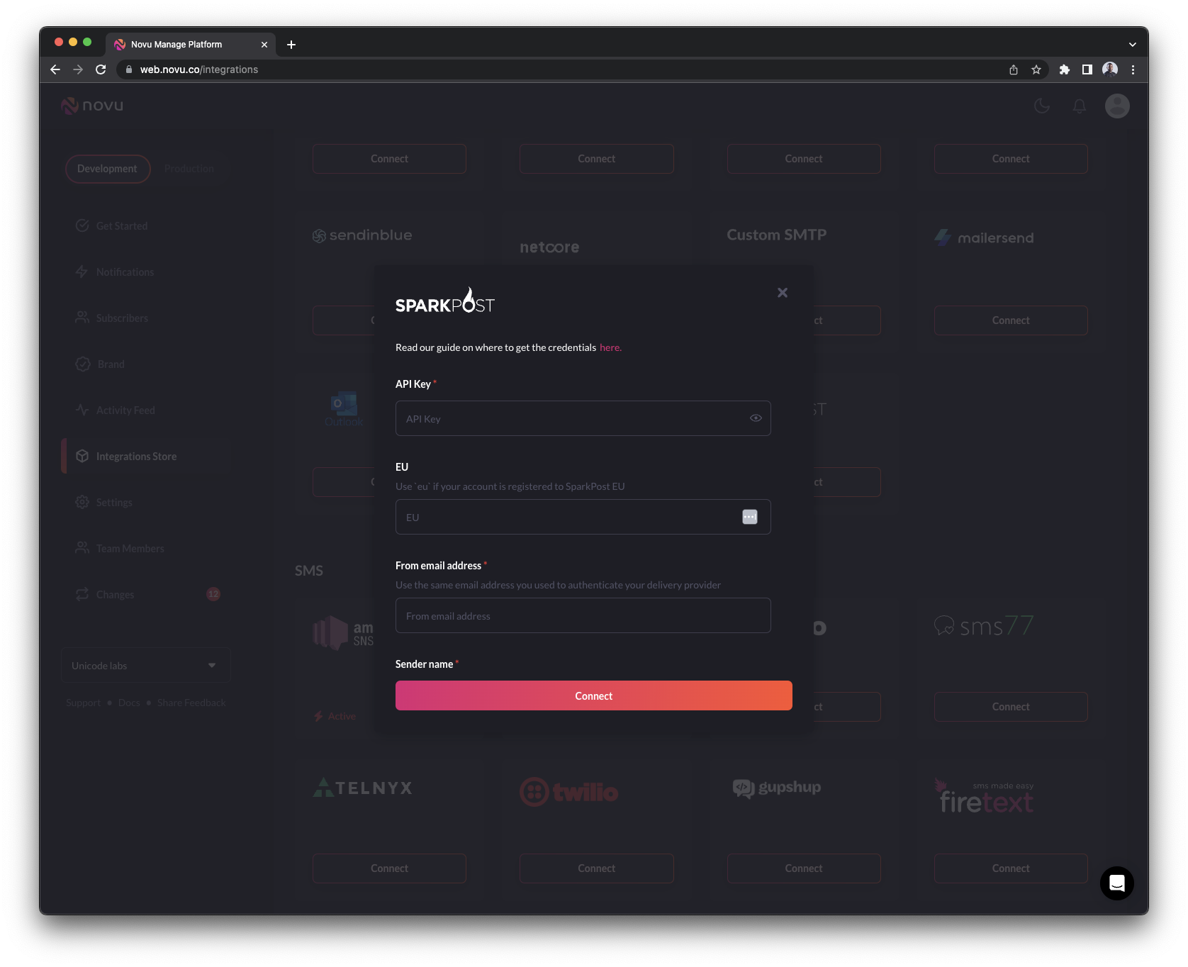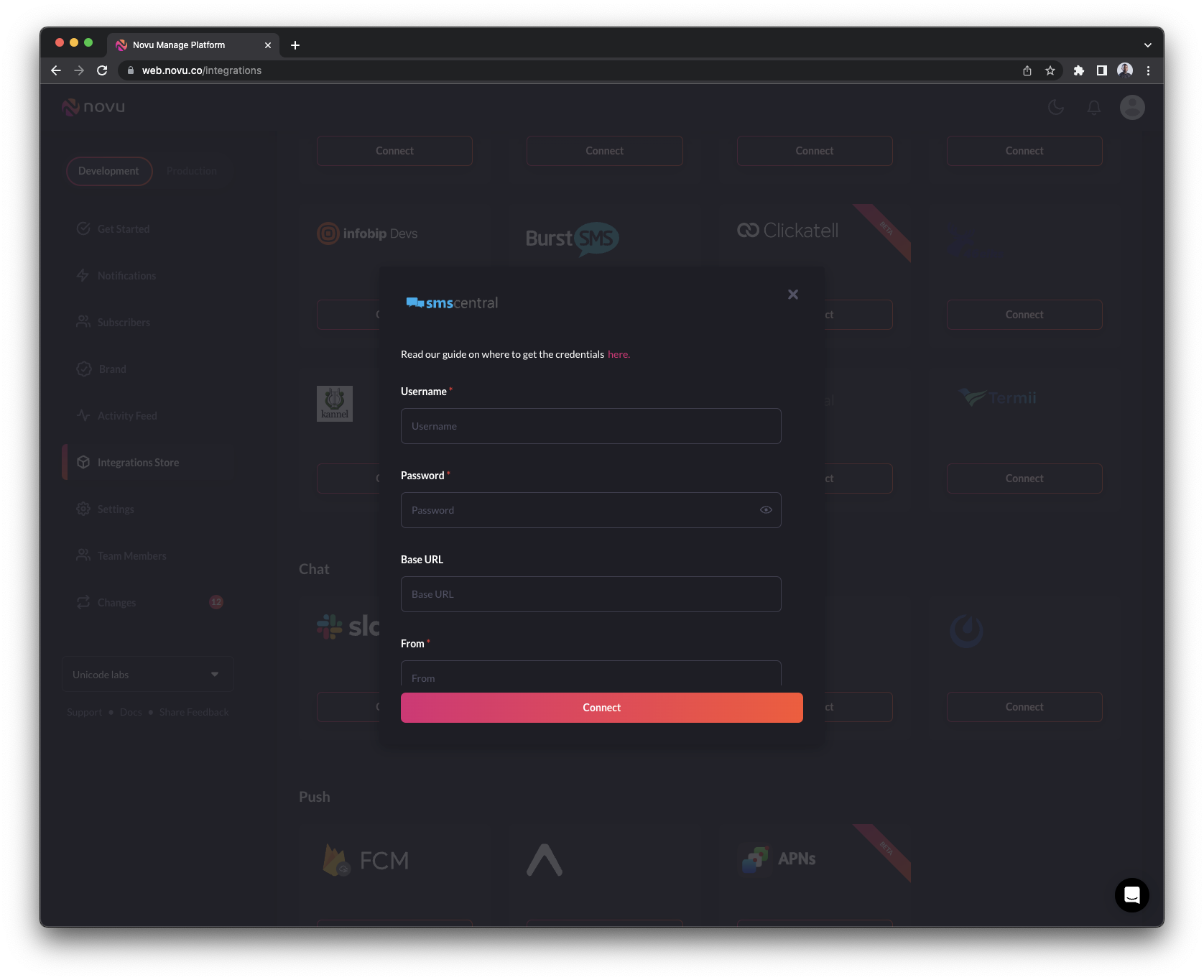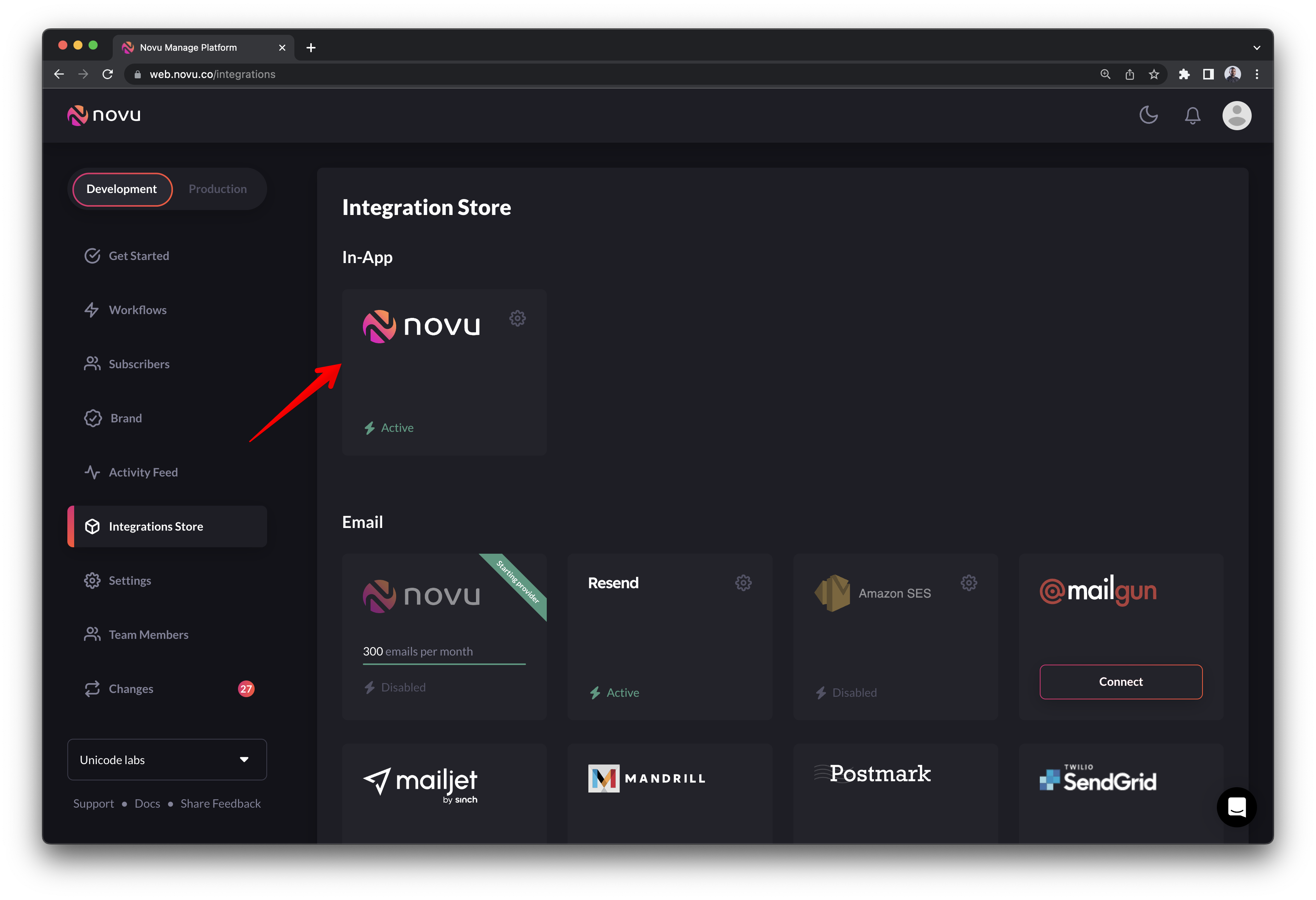 The Integration Store houses the providers for all the channels: Email, SMS, Chat and Push. The In-App channel is now part of the integration store.