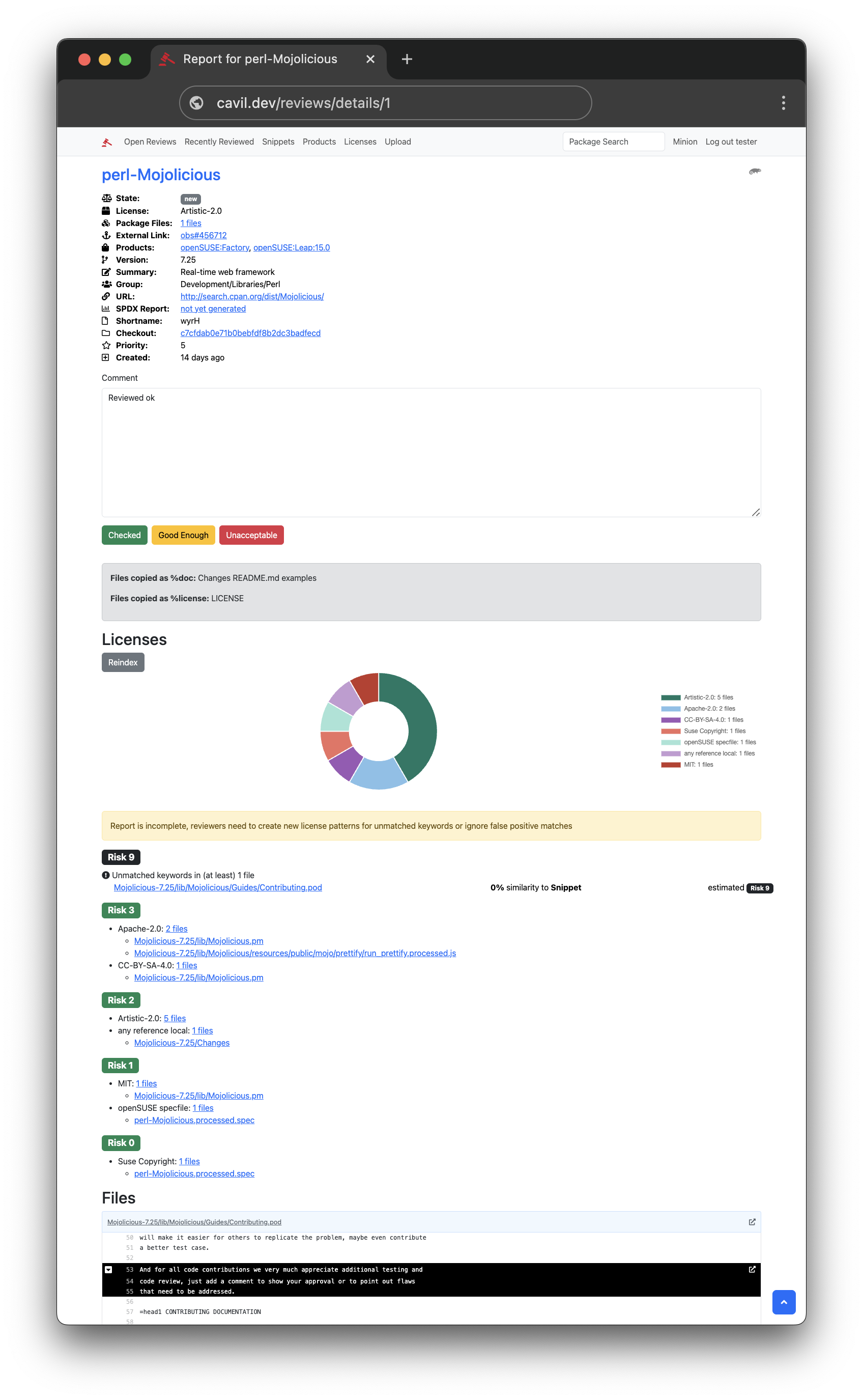 This distribution contains the two main components of the system. A Mojolicious web application that lawyers can use to efficiently review package contents, and Minion background jobs to process and index packages, to create easy to digest license reports.