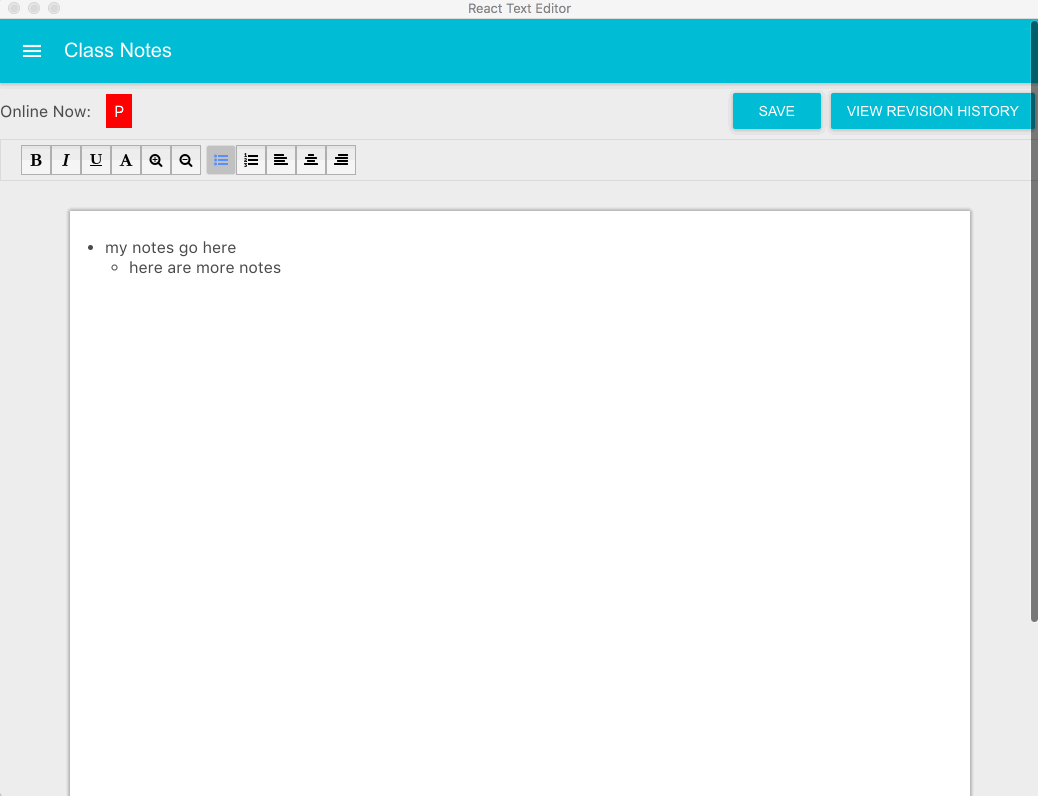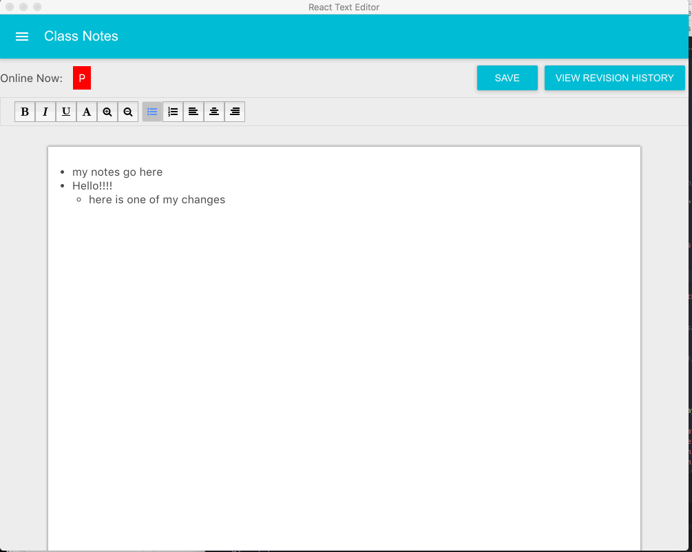 ReactGoogleDocs uses React to manage document state enabling users to view collaborators' edits and view edit history. We used MongoDB to support document persistence and user registration and credentials. Server uses NodeJS and Express and socket.io for multi-user support and real-time editing.