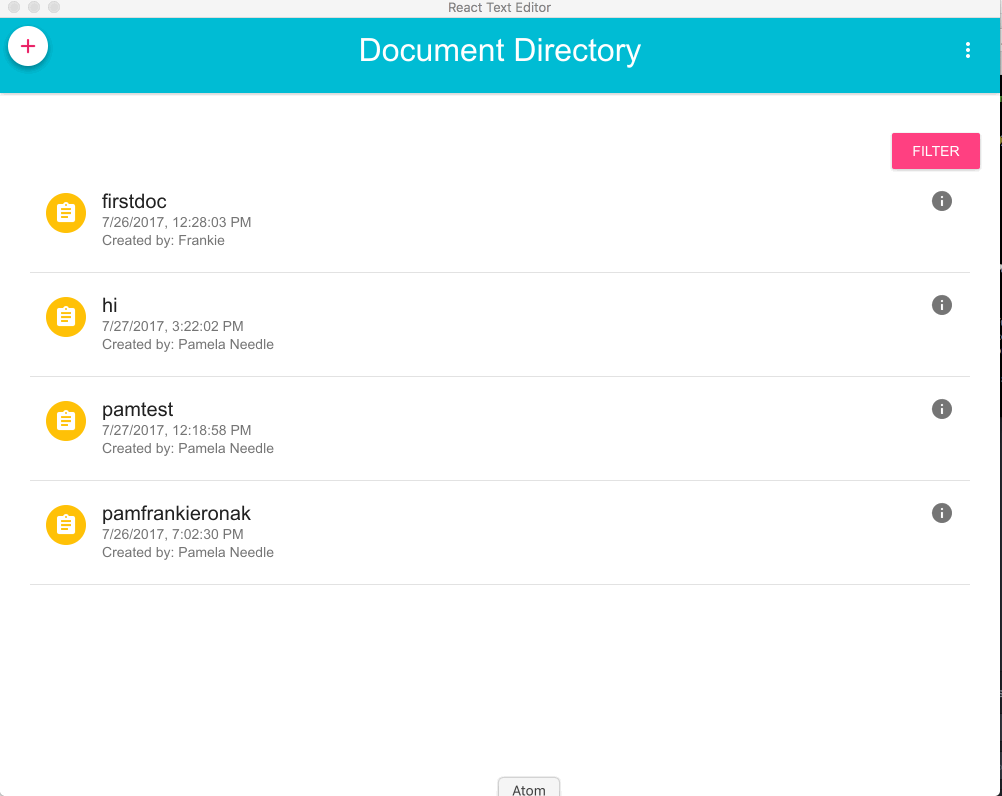 ReactGoogleDocs is a rich-text editing desktop application that supports collaboration. Users can create, view, edit and shrae their documents. Currently, popular desktop text editors such as Evernote, iNotes do not provide real-time, collaborative editing and are a big memory killer. Those that do support real-time, multi-user editing are web applications and too can quickly slow down your computer.