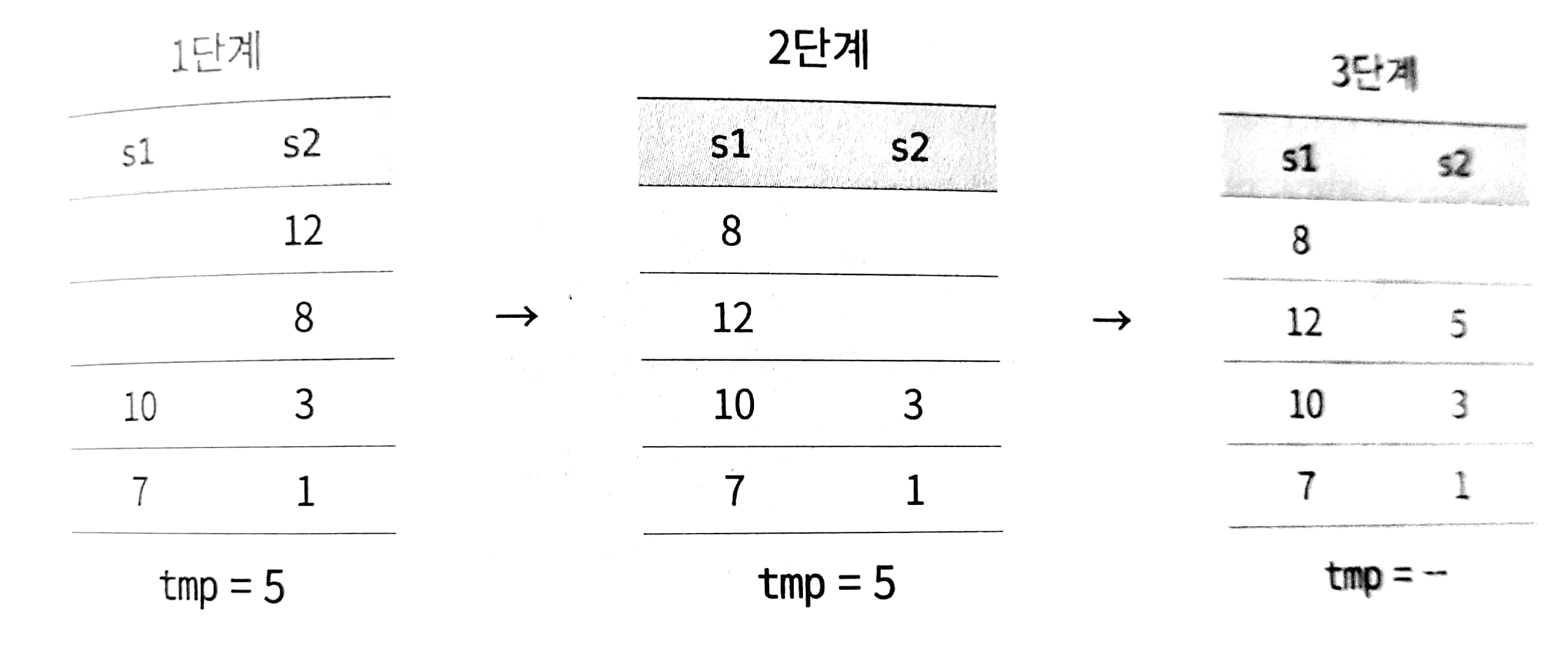 답 : 우선 s1에서 5를 꺼내서 임시 변수에 보관한 다음, s2의 12와 8을 s1로 이동시킨다. 그런 다음 5를 s2에 넣는다. 그리고 다시 s1에 있는 8과 12를 s2에 넣어준다.