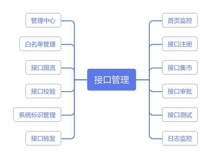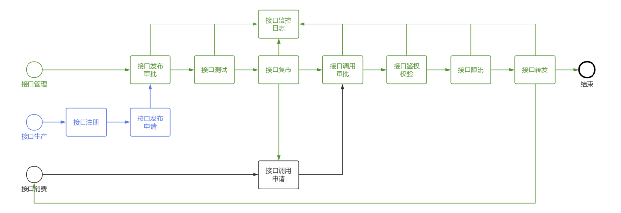 接口管理方负责对接口的审批、测试、管理、校验、限流、转发、监控,其中执行端根据管理端的配置做无状态的执行