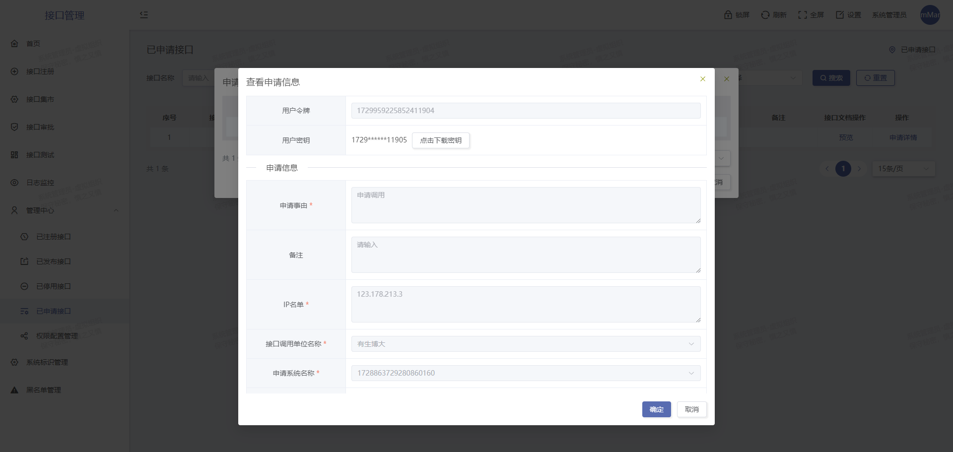 接口消费方(接口调用方)通过对接口集市中的接口进行调用申请,从而在后续流程中可以对接并使用接口