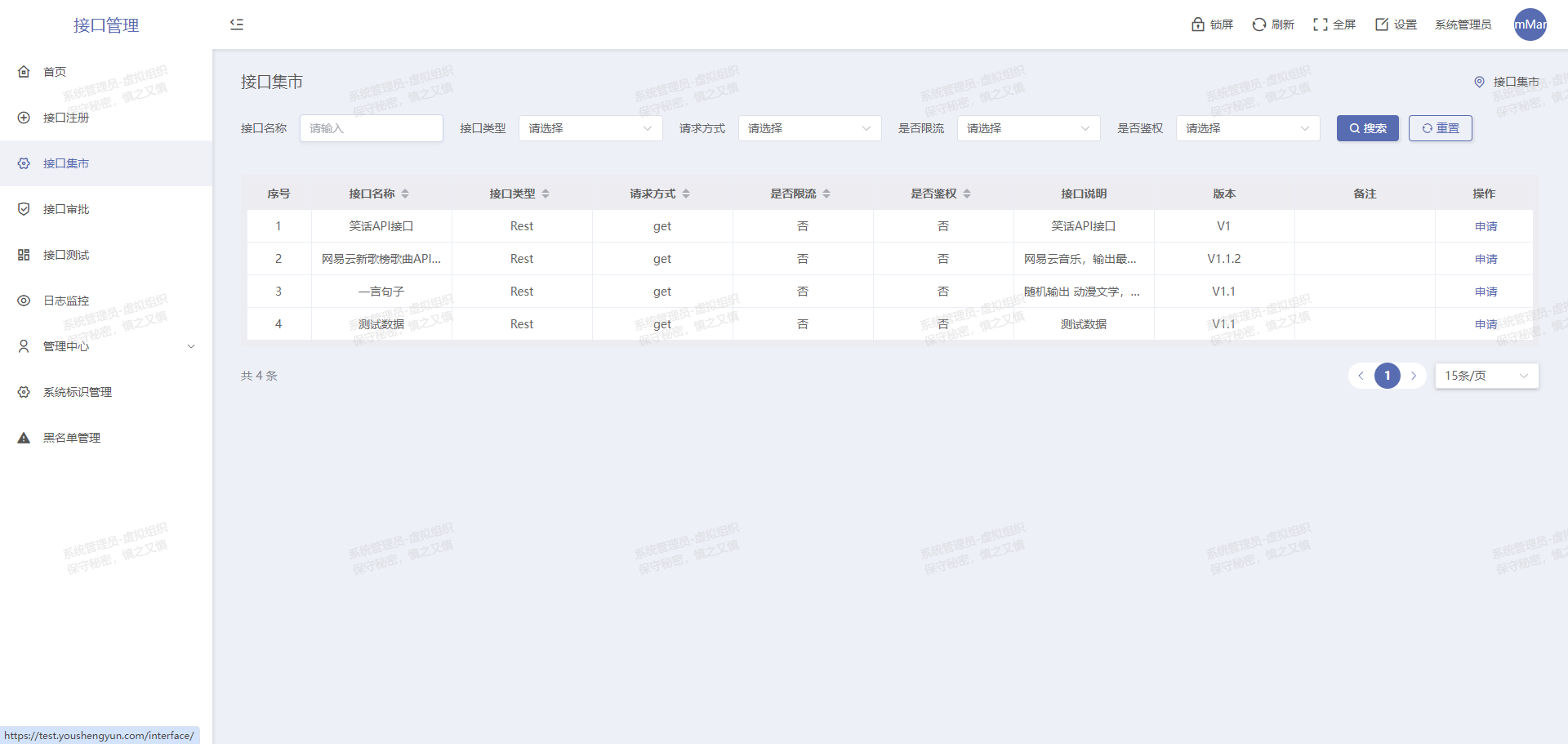 接口管理通过接口的注册、审批、集市和日志等方式对接口共享进行全生命周期的管理。接口管理注重流程化的接口共享模式和支持大规模接口转发的部署模式,从而面向多接口来源、高流量交互和复杂组织结构的场景。接口管理同时是一个轻量化的内核,支持各种面向特定场景的定制化业务改造。接口管理需要依赖开源的数字底座进行相关数据目录权限的管控。系统在线体验----->>>>>