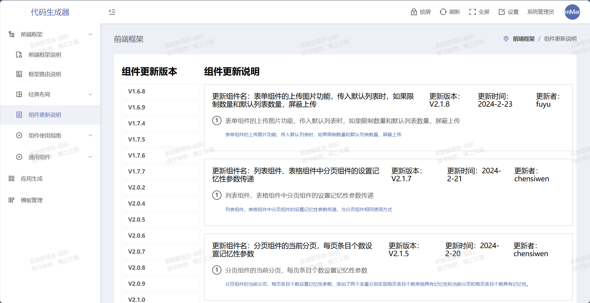 6 | 通用组件 | 主要包含卡片、弹窗、表单、过滤器、分页、表格、列表、树、图片预览、上传下载等组件(含多种样式)进行展示和代码展示 |