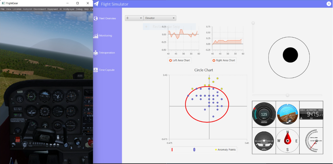 the pilot joystick (in disabled mode), Correlated graph (to the selected feature) and the Cockpit Clock Table.