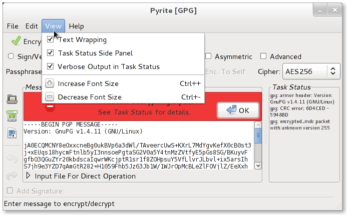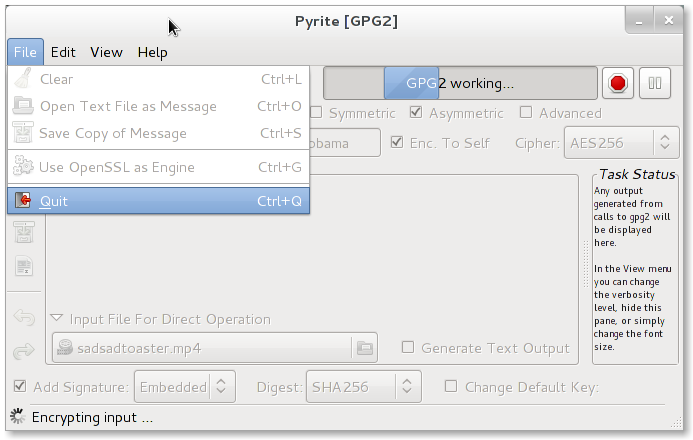 Pyrite can operate on text input or can take input and output filenames (text or binary) to pass directly to the backend program (i.e., gpg/gpg2 or openssl).