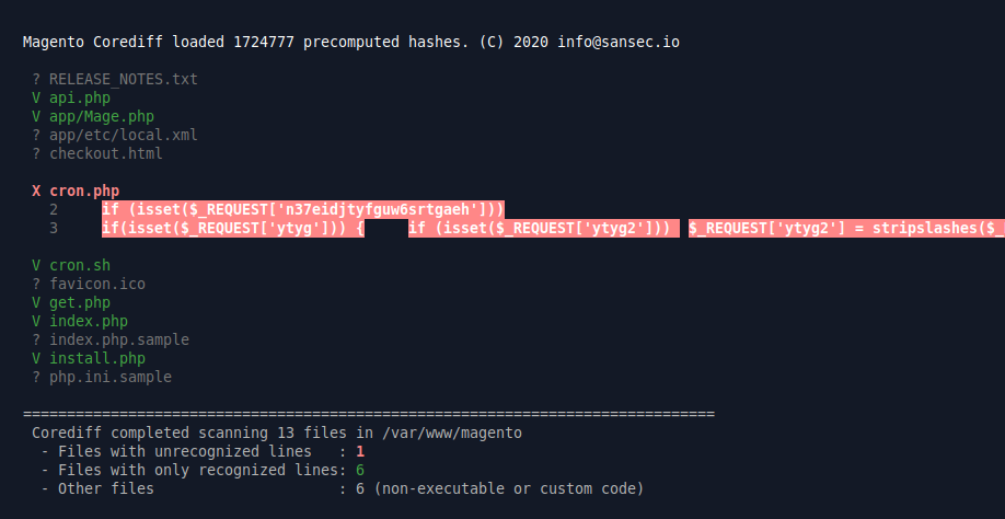 Corediff was created by Sansec, specialist in Magento security and digital forensics since 2010. Corediff analysis helped to uncover numerous cases of server side payment skimming that would otherwise have gone undetected.