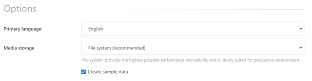 - Media storage: Here the selection is made whether the media should be stored on the file system or in the database. The default setting should remain.