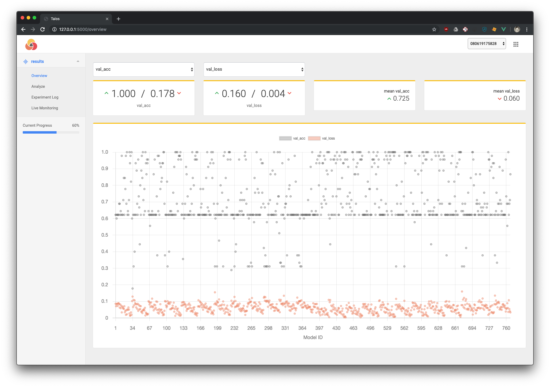Gamify radically changes the hyperparameter optimization workflow by giving the researcher powerful tools to analyze, control, and optimize the process during the experiment. Gamify is an add-on to leading hyperparameter scanning solution Talos. Talos exposes Keras functionality entirely and there is no new syntax or templates to learn.
